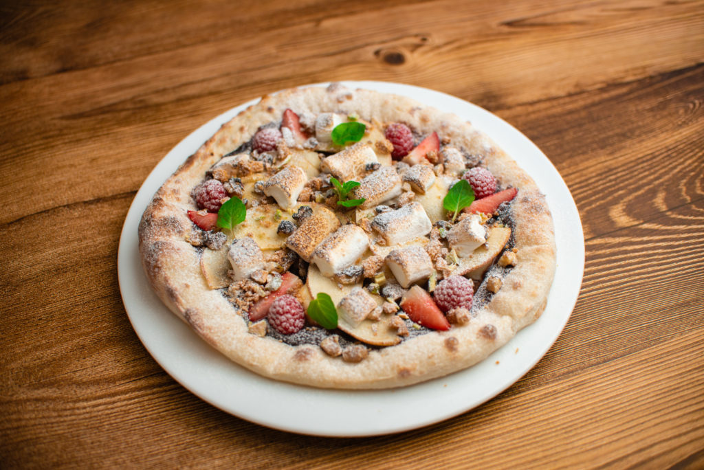 フルーツをたっぷりのせた、デザート感覚のチョコレートピザ。