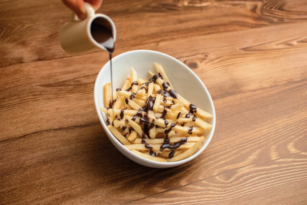 揚げたてのポテトにチョコレートソースをかけて。